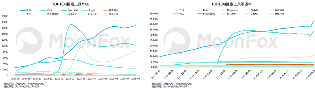 AI搜索正在占据用户搜索行为的第一选择。根据贝恩公司的研究发现,目前约有80%的消费者在至少40%的搜索中依赖AI摘要,这将导致自然网络流量减15%至25%。根据极光月狐的数据,主要AI搜索工具的渗透率与月活跃量在近一年里爆发式增长,“零点击”直接获得所需信息将逐渐占据用户心智,AI搜索工具正在逐渐替代传统搜索引擎。同时,各类应用都在创建“AI答案框”,在不同场景下一键获取信息解决用户问题成为应用的智能化体现。