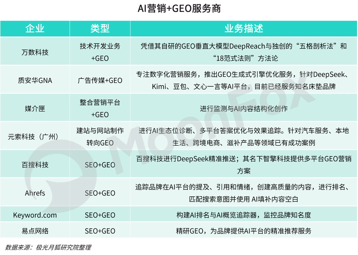 (2)AI营销+GEO:部分AI营销相关企业正在布局GEO工具实现战略卡位,多有技术能力或SEO服务经验。其在客户资源、品牌数据监测与追踪上具有较强优势。